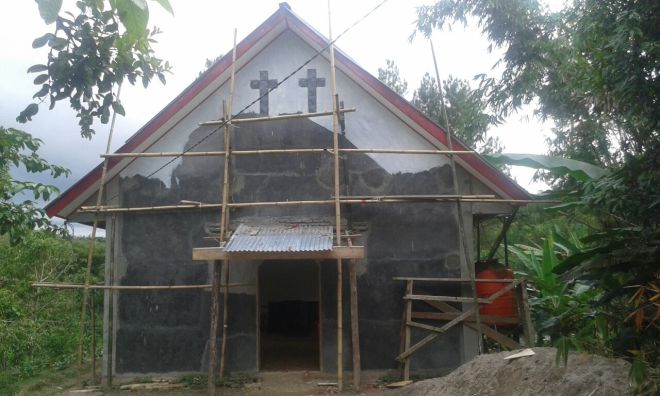 Tampak bagian depan bangunan gereja yang hampir selesai.