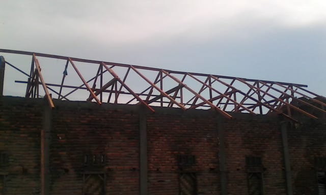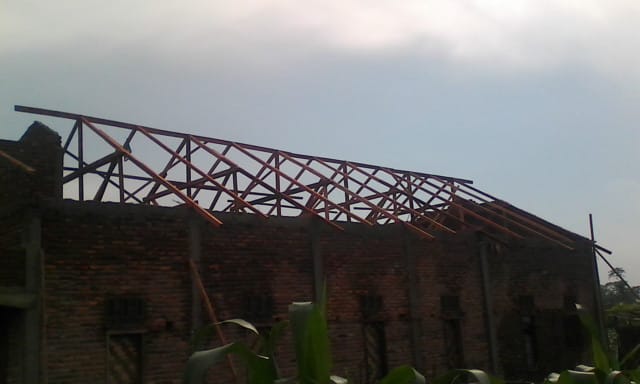 Pemasangan kuda – kuda pada atap dalam tahap penyelesaian.