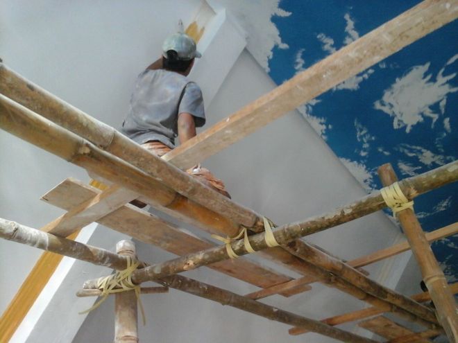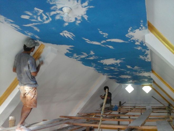 Pengecatan pada plafon dinding gereja yang hampir selesai.
