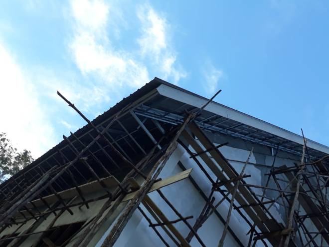 Tampak bagian atas bangunan depan gereja dalam proses pengecatan yang hampir selesai.