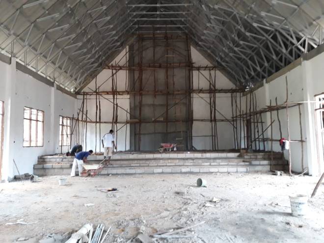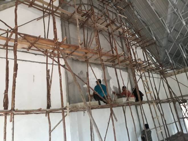 Tampak Bagian dalam dinding pada bangunan gereja dalam proses pengecatan.