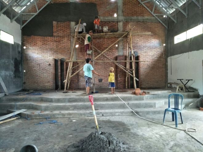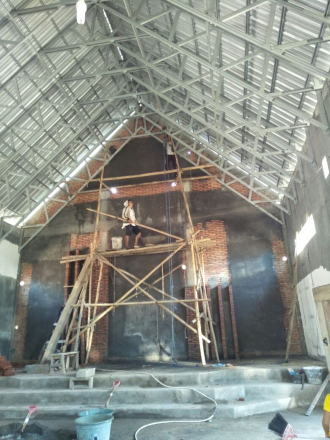 Plesteran Bagian dalam ruangan pada bangunan gereja sudah selesai dan masuk dalam tahap pemasangan tehel.