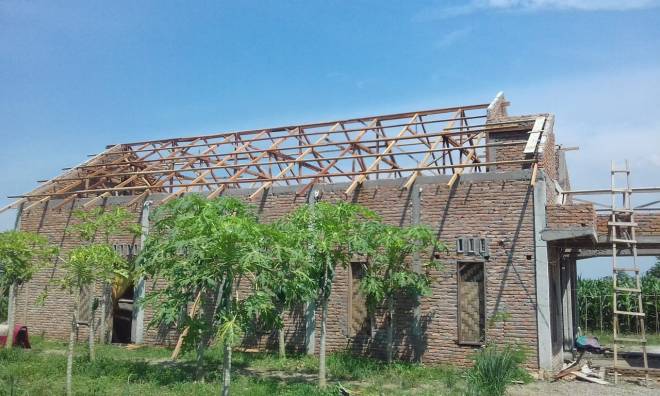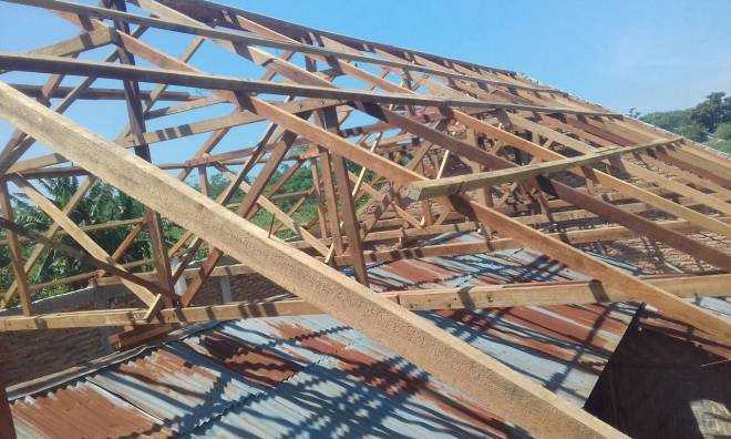 Pemasangan Atap – Atap kuda pada atap gereja sudah selesai. Tampak bagian samping bangunan gereja