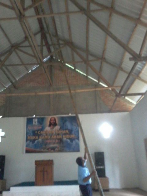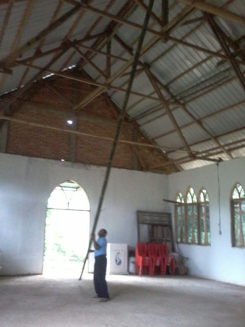 Pemasangan atap pada bagian atas gereja sudah selesai.