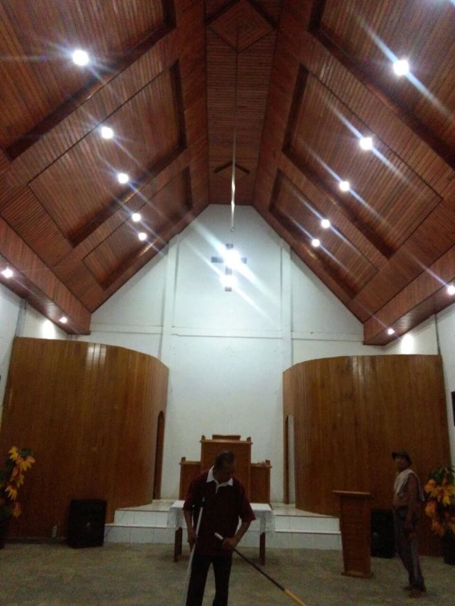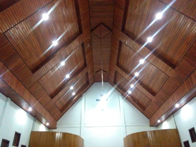 Pemasangan Plafon pada atap bangunan gereja sudah selesai. tampak bagian atas bangunan gereja