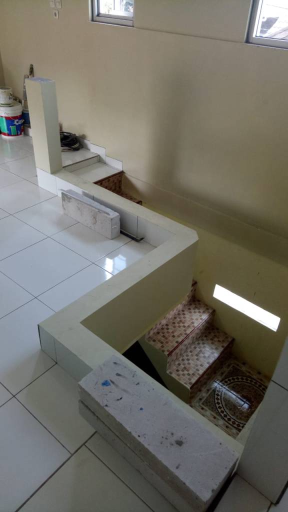 Tangga dengan pembuatan reling/ pagar tangga demi keamanan dalam tahap penyelesaian.