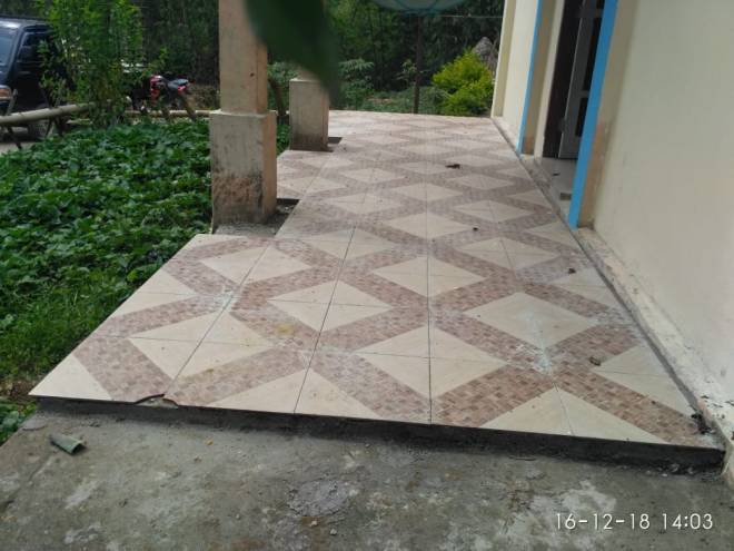 Pemaangan lantai keramik pada teras depan gereja masih dalam proses penyelesaian.