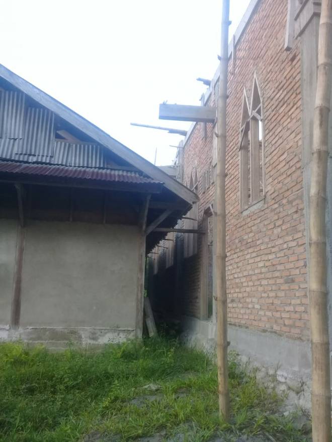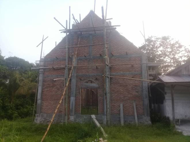 Pemasangan tembok batu bata pada bangunan gereja sudah selesai, Tampak bagian depan bangunan gereja.