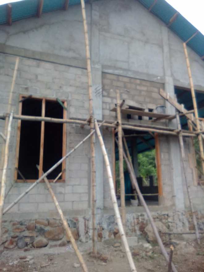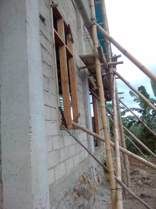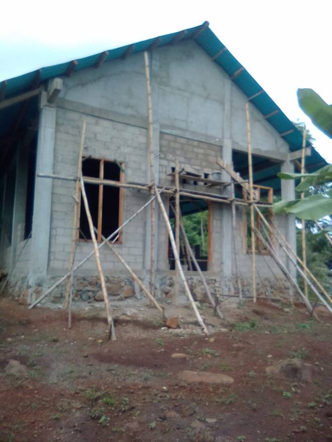 Pemasangan Batako pada tembok bangunan gereja sudah selesai bagian depan.
