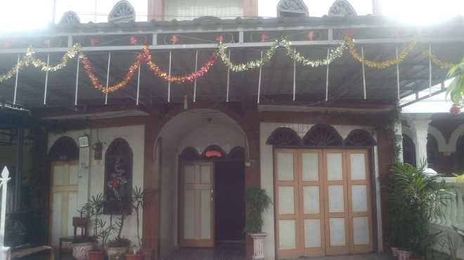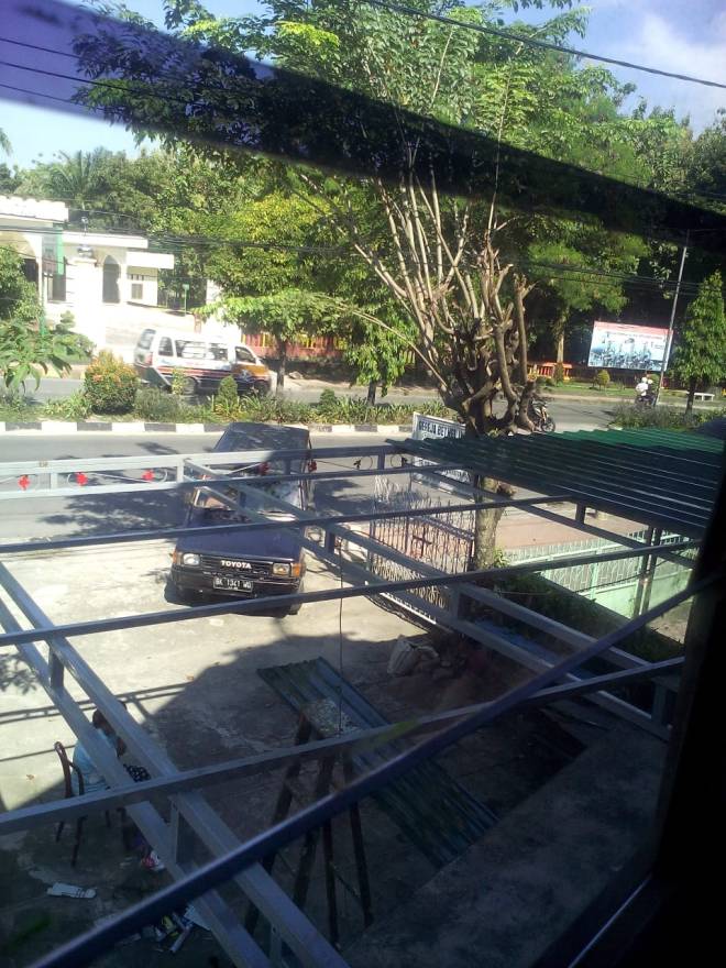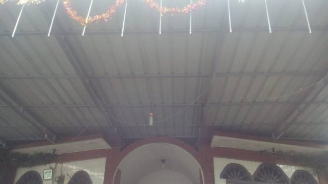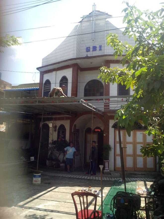 Pemasangan kanopi pada bagian depan bangunan luar gereja.