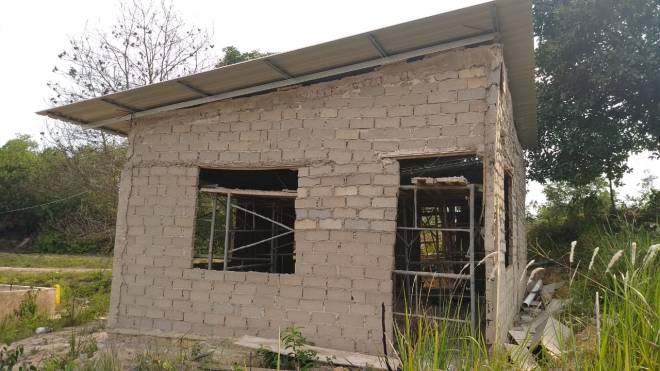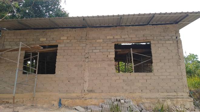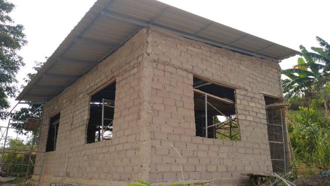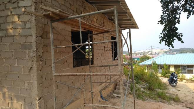 pemasangan batubata pada tembok gereja sudah selesai, juga pemasangan atap, tampak bagian depan bangunan gereja.