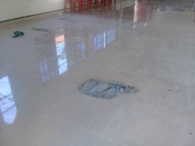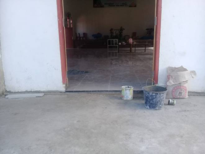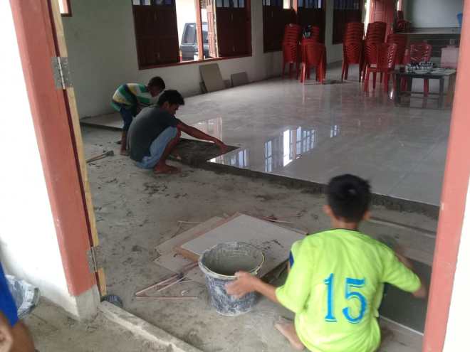 Pemasangan keramik pada bangunan gereja sudah selesai.
