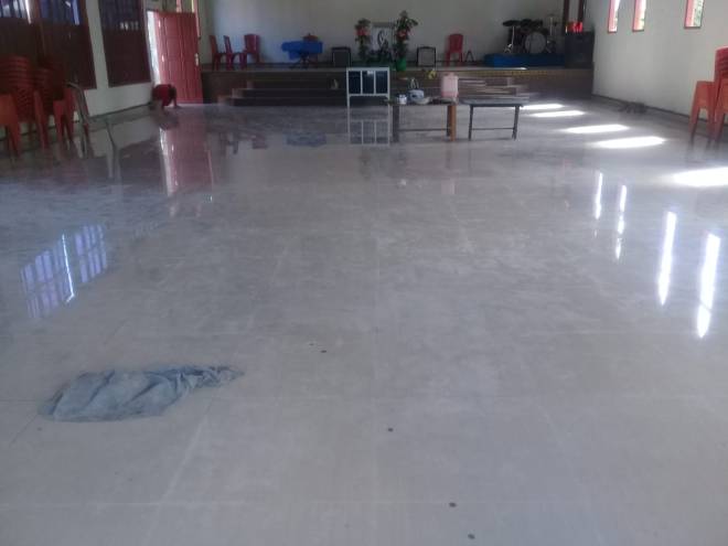 Tampak Bagian dalam bangunan gereja, pemasangan keramik sudah finishing.