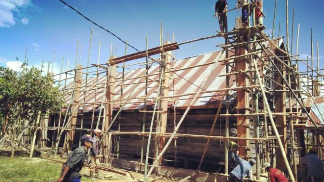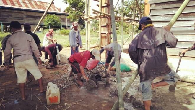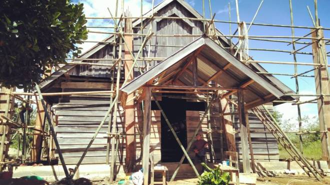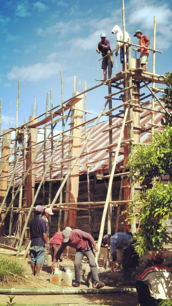 Tampak Bagian depan bangunan gereja, pengecoran tiang besi pada tiap sudut bangunan gereja yang akan dibangun.