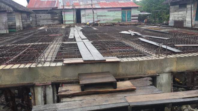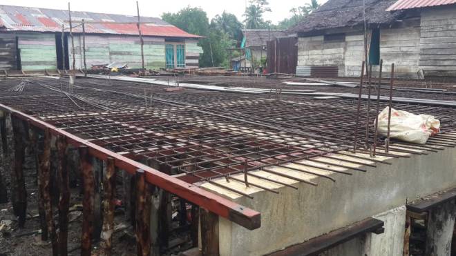 Pemasangan kawat besi pada bagian dasar bangunan untuk pengecoran sudah selesai.