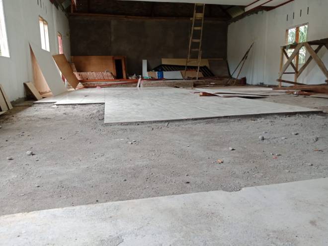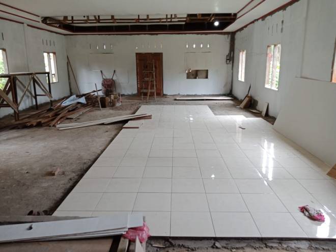 Pemasangan keraik pada lantai bagian dalam dalam tahap penyelesaian.