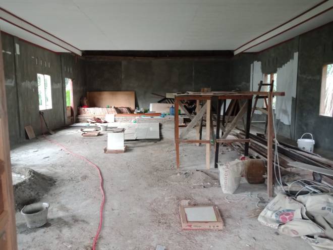 Pemasangan plafon pada bagian atas bangunan sudah selesai.