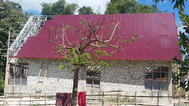 Pemasangan Atap ringan pada bagian atas bangunan gereja sudah selesai. Tampak bagian depan bangunan gereja.