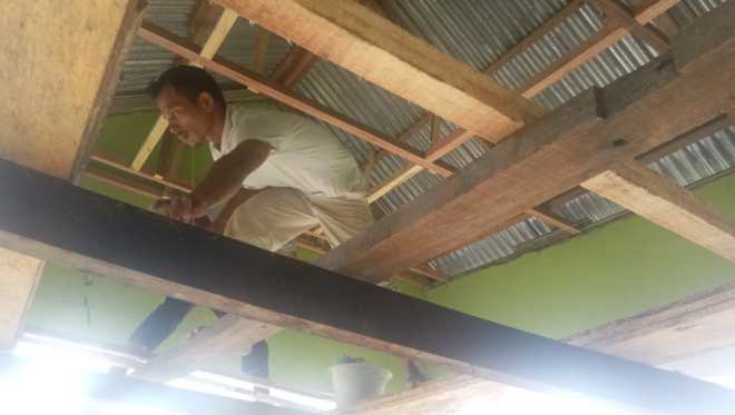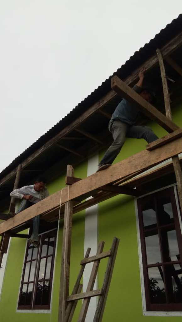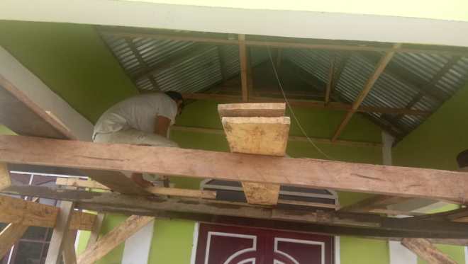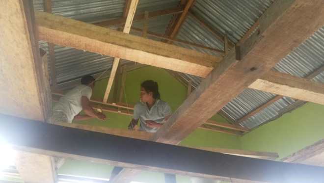 Pemasangan Plafon pada bagian atap bangunan gereja masih dalam proses pengerjaan.