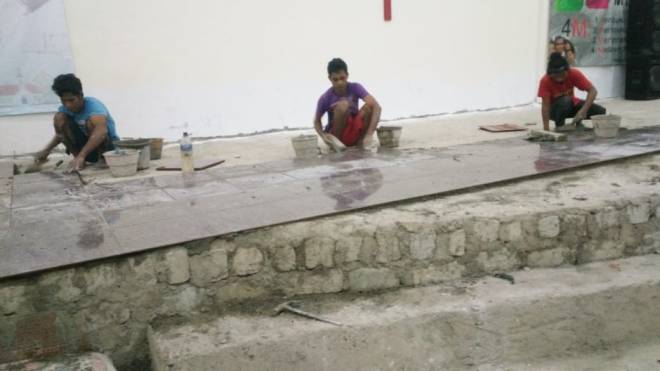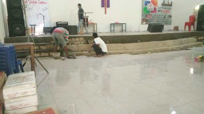 Pemasangan keramik pada lantai banguna gereja bagian dalam proses pengerjaan.