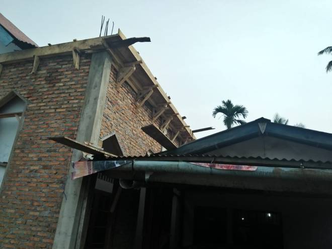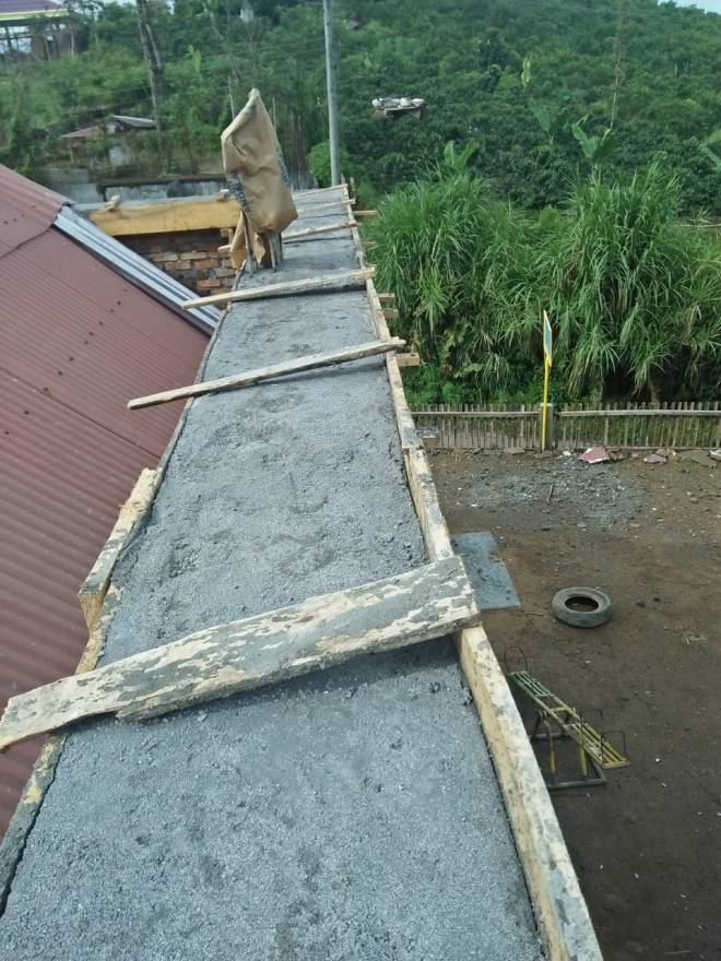 Pengecoran balok untuk talang air pada bangunan gereja dalam proses pengerjaan.