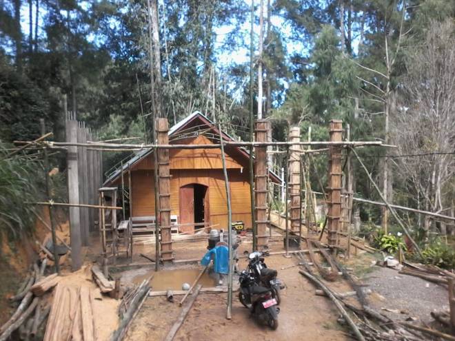 pemasangan Tiang besi pada dan pengecoran masih dalam pengerjaan. Tampak bagian depan bangunan gereja.