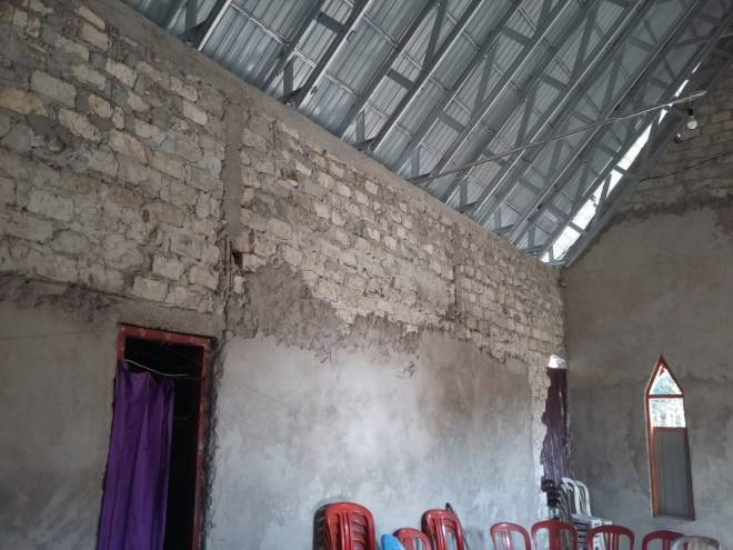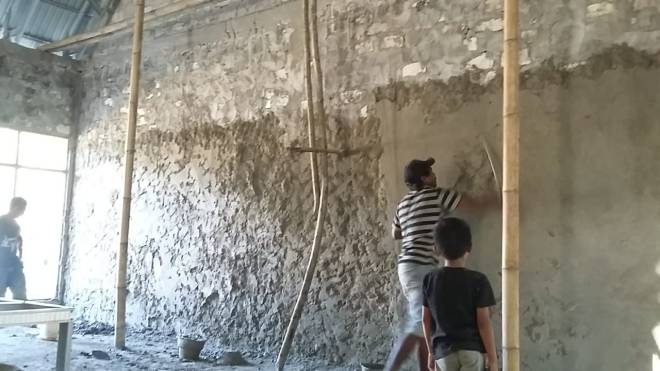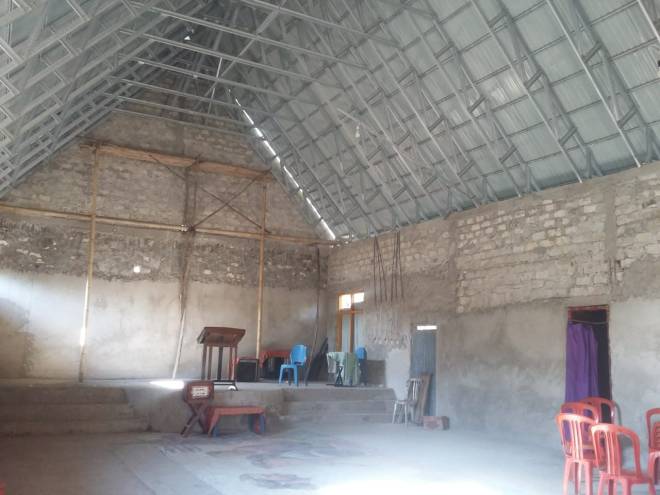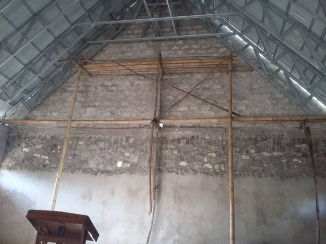 Plester Pada bagian dalam ruangan gereja masih dalam pengerjaan. Tampak bagian dalam ruangan secara keseluruhan.