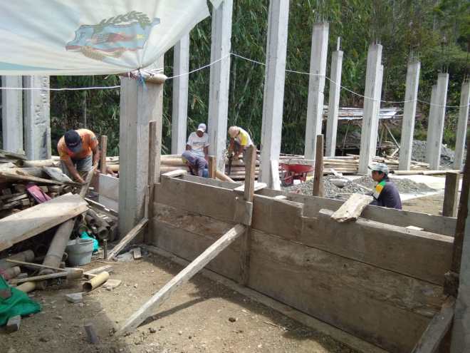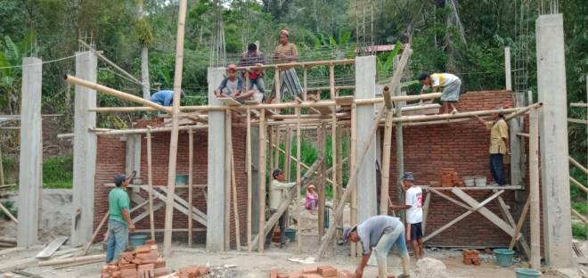 Pemasangan Batubata pada bagian tembok gereja masih dalam pengerjaan.