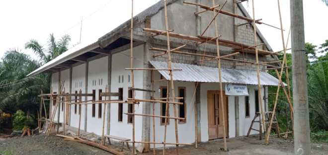Proses pengecatan pada bagian luar bangunan gereja dalam tahap penyelesaian, tampak bangunan luar.