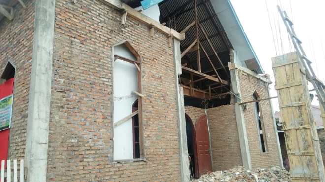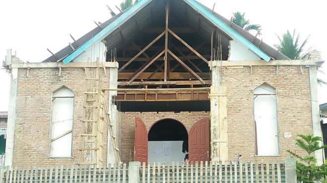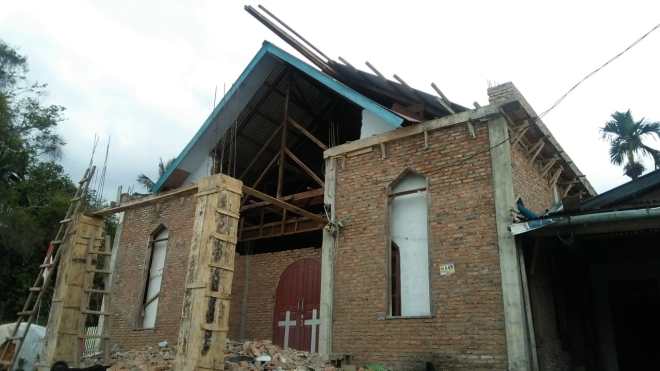 Tampak pemasangan atap pada bagian atas bangunan gereja sudah selesai.