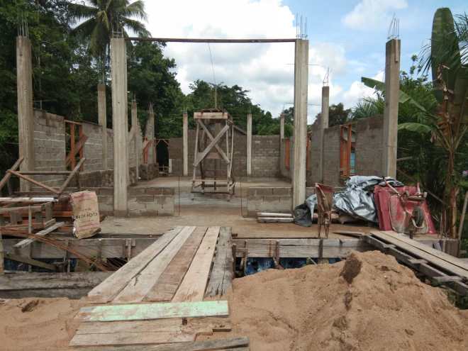 Pemasangan Batubata pada bagian tembok bangunan gereja masih dalam pengerjaan.