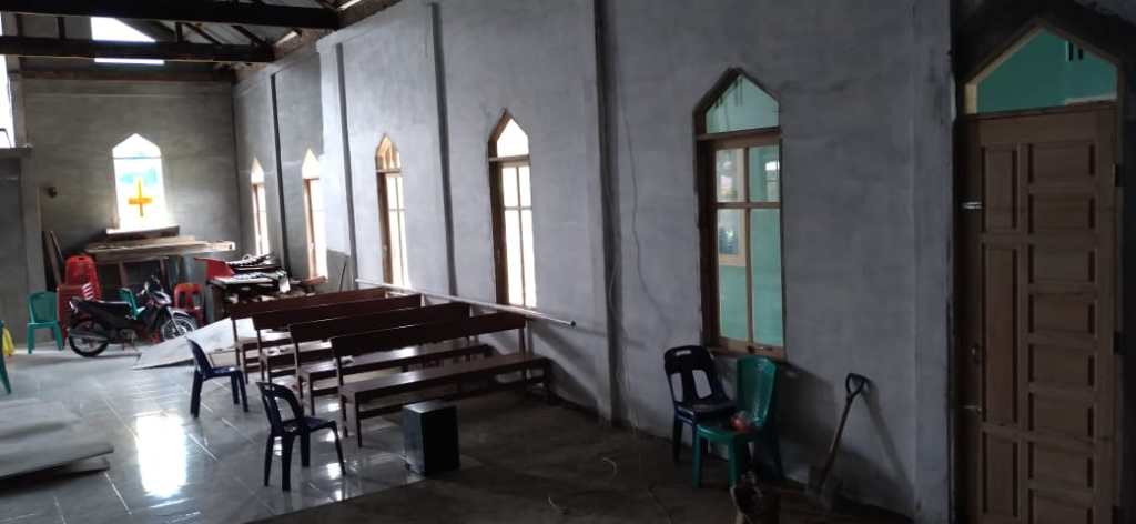 Pemasangan Pintu Bagian depan Bangunan gereja sudah selesai. PemasanganJendela pada bagian Bangunan Gereja. Tampak Samping Kiri Bangunan bagian dalam.Tampak Samping Kanan Bagian dalam BangunanTampak Bagian Luar bangunan Gereja