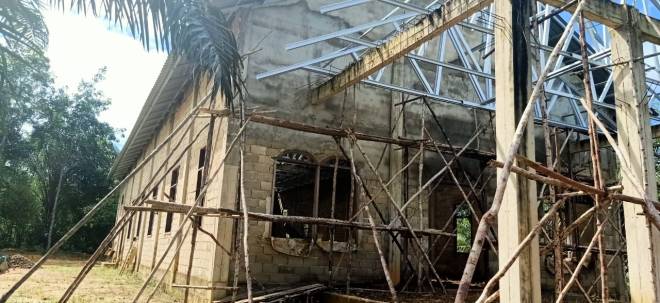 Pemasangan Kerangka bagian depan dan dalam bangunan gereja, masih dalam pengerjaan.
